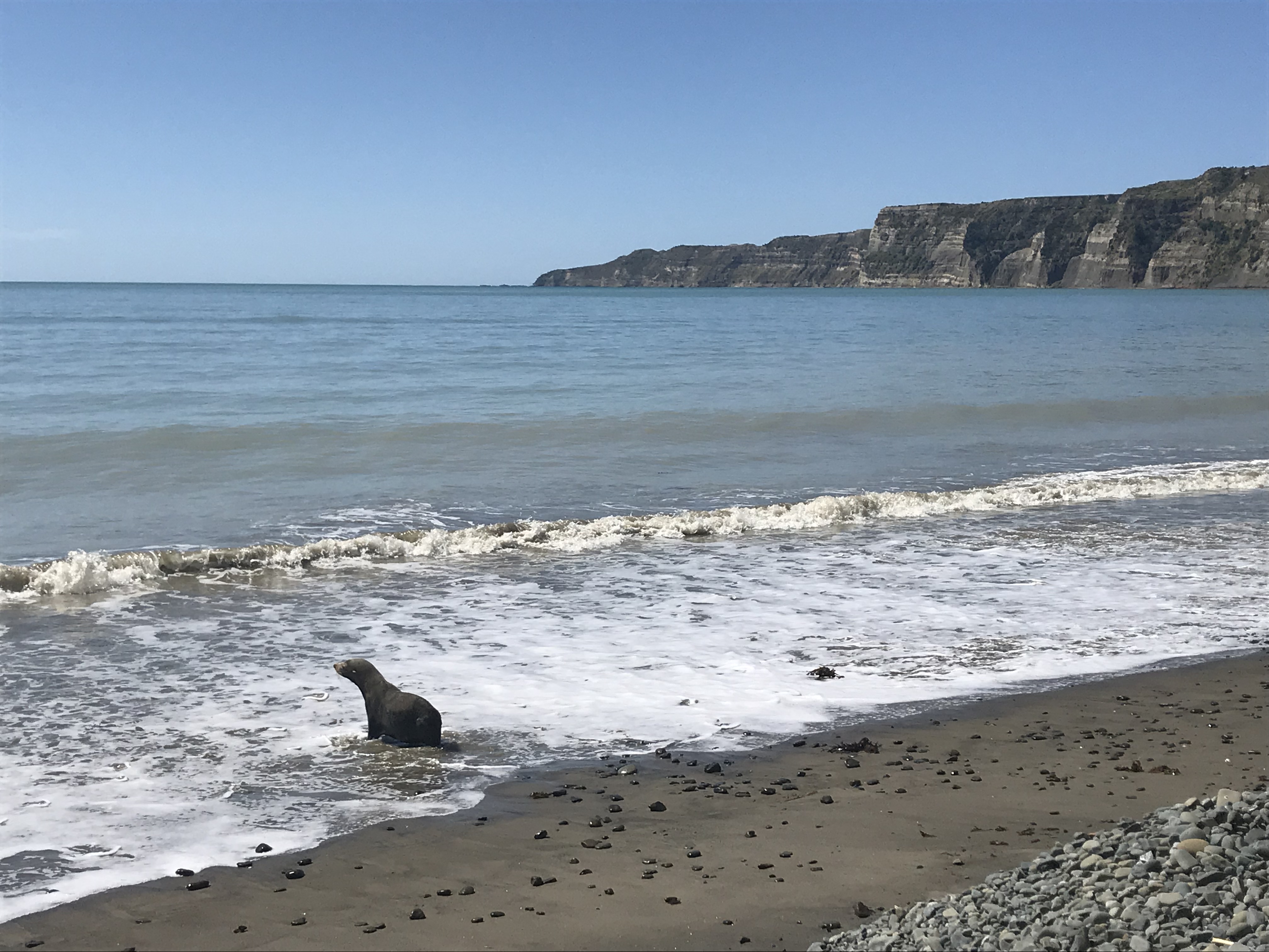 Irgendwann mussten wir dann aber auch weiterfahren, da wir natürlich noch so einiges mehr sehen wollten. Für uns ging es dann also weiter zum Cape Kidnappers. Dabei handelt es sich um ein Kap, welches wirklich richtig, richtig schön ist und für seine Tölpel Kolonie bekannt ist. An die Spitze des Kaps konnten wir leider nicht gehen, da sowohl der Wanderweg als auch die Straße dorthin gesperrt waren. 😅Natürlich haben wir uns es aber trotzdem nicht nehmen lassen zumindest am Strand entlang so weit wie möglich zu laufen (wegen der Flut konnte man nämlich auch dort nicht bis zur Spitze des Kaps laufen). Wir waren echt völlig begeistert von der Natur dort, vor allem von den Klippen. Von der Tölpel Kolonie haben wir nicht gesehen😂, aber das finde ich jetzt persönlich auch nicht so schlimm. Wir haben aber etwas viel, viel Besseres gesehen. Als wir nämlich am Strand entlanggelaufen sind, wäre ich beinahe über einen Seehund gestolpert, der sich am Strand gesonnt hat. Wir konnten den dann noch total lange beobachten, bis er dann so richtig süß ins Meer gewatschelt ist. Das war einfach nur der Wahnsinn. ❤️